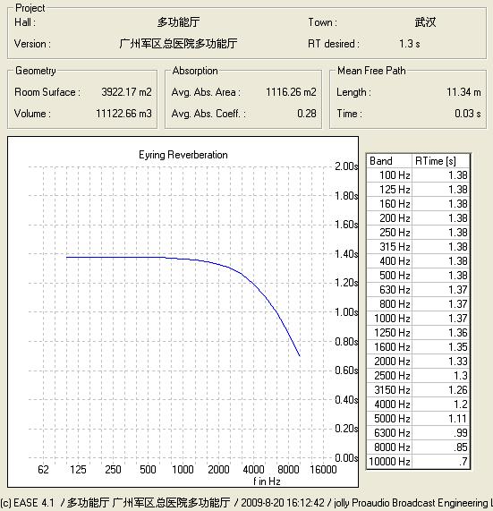 通过以上工作我们可以得到该厅堂的容积、反射面积、吸收系数以及混响时间等重要声学参数,然后我们才能依据参数进行设计,其中混响时间对于厅堂扩声来说尤为重要。