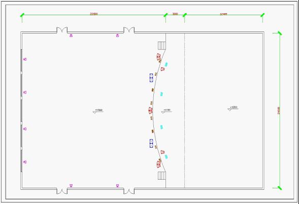 我们依据甲方提供的平面图纸及实地勘察后,辅助用声场设计软件在计算机上建立该厅堂的模拟房间数据,并从中得到该厅堂的相关数据。(辅助设计软件为德国EASE 4.1目前最高版本)模型如下图: