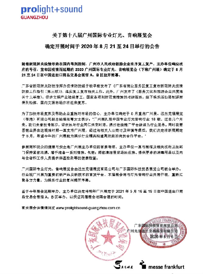 伴随着国内情势持续向好,广东省广州市政府鼓励广大企业安全有序复工复产。广州科展响应政府的号召,终于宣布由于疫情而延期的2020广州国际专业灯光、音响展览会确定于8月21到24号在中国广州市琶洲进出口商品交易会展馆A、B区拉开序幕。
