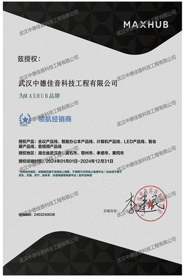 武汉中德佳音科技工程有限公司获得“利亚德、MAXHUB授权证书”,这标志着公司在音视频系统集成领域获得了业内知名品牌的高度认可和支持。