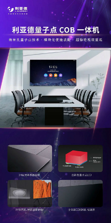 利亚德量子点COB一体机是一款集成了前沿显示技术的产品,它采用了量子点红光芯片,相较于传统的COB产品,具有以下显著优势: