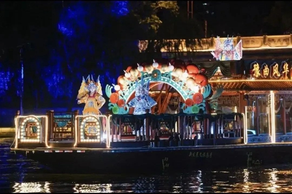 一袭红绸卷出二七塔耸立,辉煌的二七精神永放光芒;高铁如闪电般飞驰而过;中原科技城灯火辉煌高楼大厦,科研精英忙碌的身影在水幕中穿梭,科技创新的活力。船缓缓在河道中穿行,彩虹对喷打出水雾升腾,激光营造出时空隧道,游船鱼贯而入,犹如神龙出水。