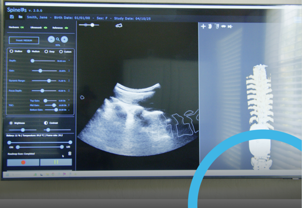 AI算法辅助:结合AI算法,OptiTrack系统能够识别出超声图像上的骨骼结构,即使在没有明显显示的情况下也能形成精准且清晰的脊柱3D骨骼图像。